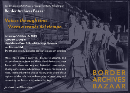 The Border Heritage Center (BHC) will be at the Border Regional Archives Group's 9th annual Border Archives Bazaar at the New Mexico Farm & Ranch Heritage Museum, Saturday, October 18, 2025 in Las Cruces, New Mexico. Visit our table to learn more about BHC's special collections and services and view a sampling of some of the archival materials held within our collections. Over a dozen southern New Mexico and west Texas libraries, archives, museums, and historical societies will also be participating! Come and learn about what archival institutions across the borderland region do, hold, and preserve.